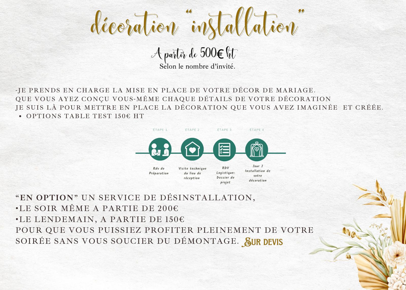Le jour de votre mariage mon équipe et moi serons là pour installer toute la décoration Imaginée et vous assurer de sa bonne mise en place.
